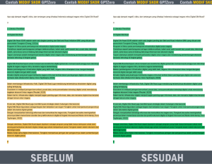 Menurunkan Skor Plagiasi Turnitin dengan cara manual baik Paraphrase Plagiasi maupun Humanize Ai tanpa Trick atau Joki, sehingga hasilnya dijamin aman 100%. Bila dicek lagi maka hasilnya akan tetap sama.